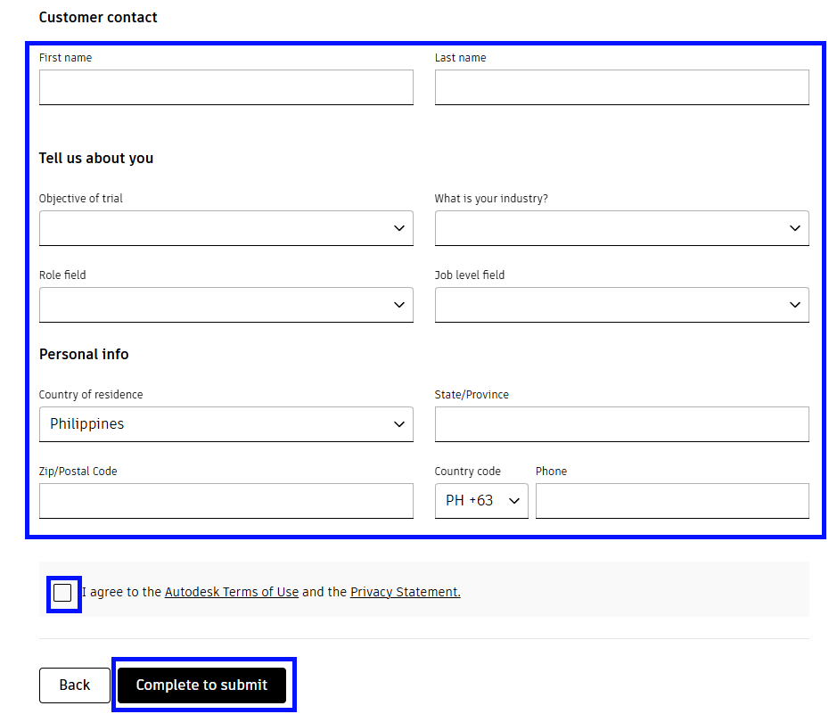 5. Fill out all the necessary information. All fields are required unless noted. Agree to the Terms of Use and Privacy Statement, then click ‘Complete to submit.’