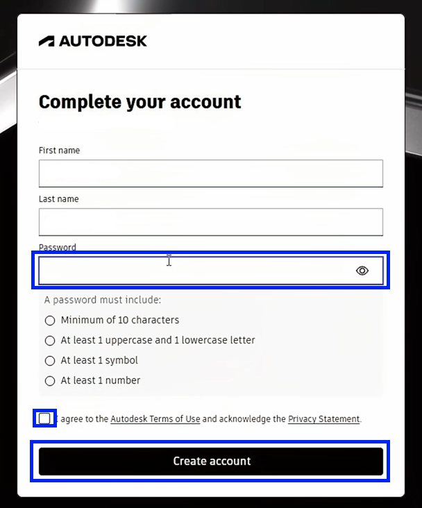 8. Confirm your email and set up your password. Agree to the Terms of Use and Privacy Statement, then click ‘Create Account.’